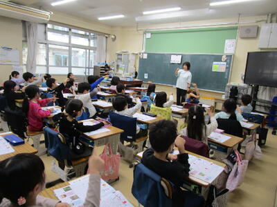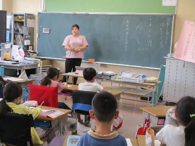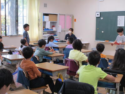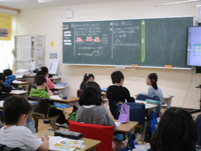 2年生、国語で書くと同じでも読むと違う言葉の学習をしていました。「一本しかないはし」を子供たちが「橋」と「箸」だとアクセントが違うということに気づき意味の違いがわかるように読んでいました。
