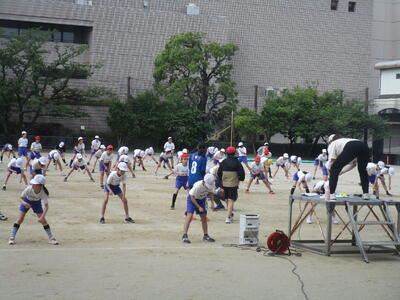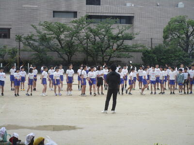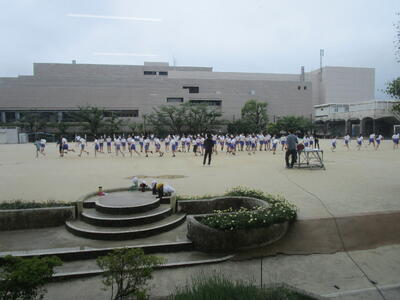 5年生、朝の時間に、子供たちが運動会でやる「エイサー」を掛け声をかけながら、踊っていました。シャキシャキ動けていてかっこいいです。