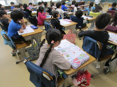 1年生、国語で「あかさたな ・・・」等、発音の練習をしているクラスや言葉集めをしているクラス、体育の着替え中に廊下で静かに本を見て待っているクラスもありました。