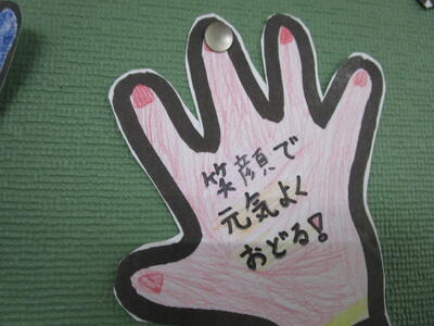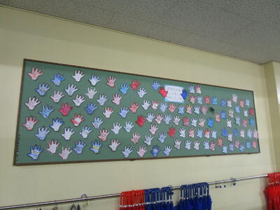 4年生、掲示板に運動会の目標を書いていました。手形の中に、一人ずつの目標が書かれていました。