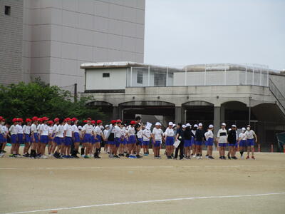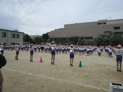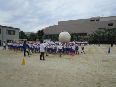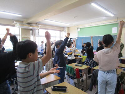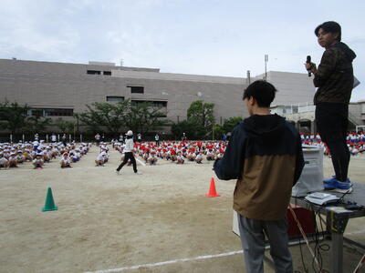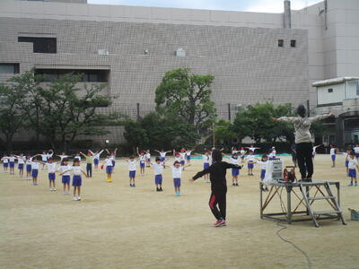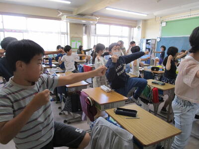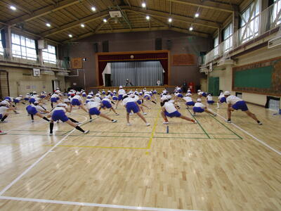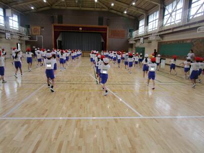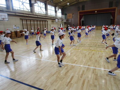 2年生、体育館で、運動会の退場の確認をしていました。その後、先生が「皆で通して踊りましょう」というと、「やった!」と子供たちから声が上がりました。リズムに乗ってとても楽しそうに踊っていました。