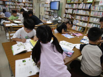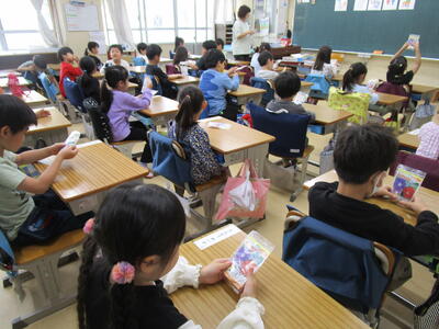 2年生、図書室で本を使って調べる活動をしていました。調べた本の題名や作者を書くために、本の中の作者名のある場所を皆で確認していました。