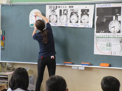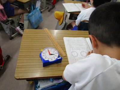 2年生、算数の「時こくと時かん」の学習です。大きな時計を使い、先生が前で時間や時刻の確認をしていました。隣のクラスでは、それぞれが動かせる時計を持ちながら確認をしていました。