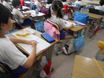 4年生、木をよく見て、絵を丁寧に描いていました。木の幹や枝、葉っぱの色も何色も使って塗ってありました。背景を塗るのに、木を目立たせるにはどうしたらよいのか、子供たちが考え、確認していました。どんな絵ができあがるのか楽しみですね。