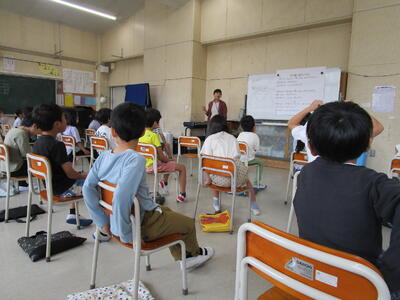 5年生、体育のハードル走が雨のため、校庭で実施できません。教室で、今までの振り返りと、これからどんな練習をしていくかの話をしていました。