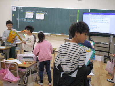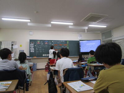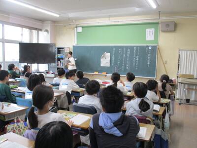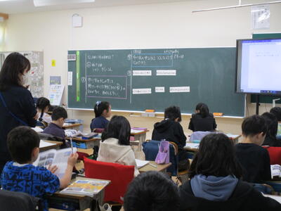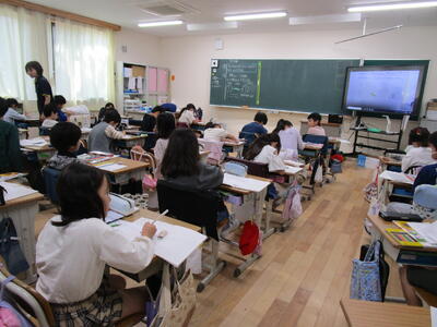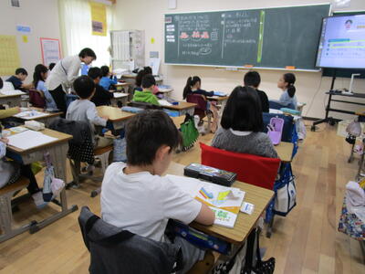 3年生、算数で割り算、5年生小数のかけ算の学習です。黒板に分かりやすく、お金の絵をはったり、いろいろな考えを書いたりして、子どもたちも発言をしながら授業をすすめていました。