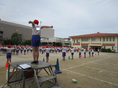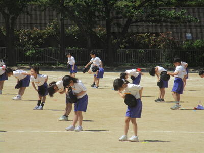 1年生、運動会で使用するシルクハットをうれしそうに頭にのせて、ダンスの練習の前にラジオ体操の練習をしていました。何をしていても、かわいらしいです。