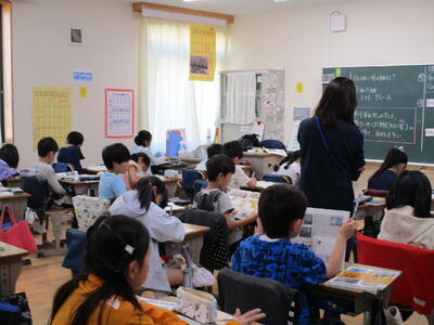 5年生、国語で「二つの新聞を比べ、なぜ記事の大きさや配置が違うのか」ということについて投げかけると、子供たちから「伝えたいことが新聞社ごとに違うから書き方が違う」という意見が出て、実際の新聞で確認をしていました。