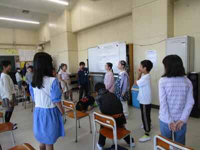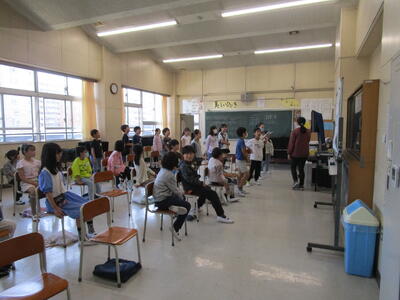 2年生、学校探検の先生インタビューの練習を班や二人組で確認していました。3年生は、音楽室で「あの青い空のように」のやまびこの練習をしていました。皆が代表をやりたがっていて、やる気がすごかったです。