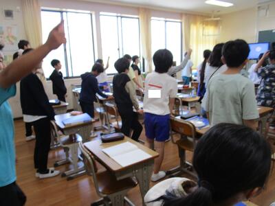 4年生、学活で「5種類の動物のアクティビティー」をしていました。自分が生まれかわるなら、「クジラ・ライオン・ワシ・カメ・カメレオン」の何を選ぶか、なぜほかのものは選ばなかったのか、まずは、一人ずつの考えをワークシートに書いてから、全体で交流しました。いろいろな意見が出て、理由も異なっていました。先生が「このクラスの人は、全員が同じ考えではないですね。ライオンがいいという人もいれば、それは嫌という人もいますね。でも、集団として生活していくときどんなことに気をつけたらいいですか。自分の考えを書いてみましょう」と言いました。子供たちからは「自分と同じじゃなくても、認め合うことが大切」「自分と違っても、マイナスの言葉はいわず、まずは意見を聞いて、自分の意見を言うことが大切」などの意見がでていました。