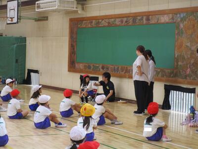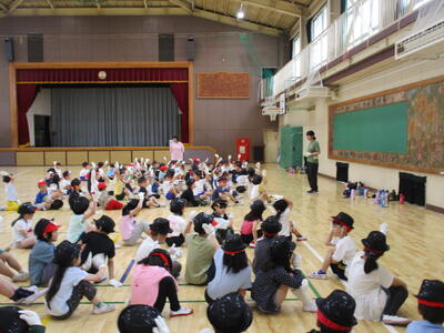 1年生、体育館でシルクハットをかぶって、先生の話を聞いたり、準備体操をしたりしていました。準備体操は、ラジオ体操を毎時間やっているせいか、前回見た時よりもかなり上手になっていました。