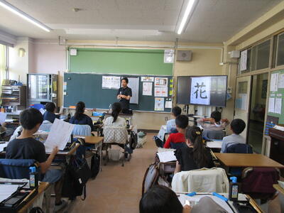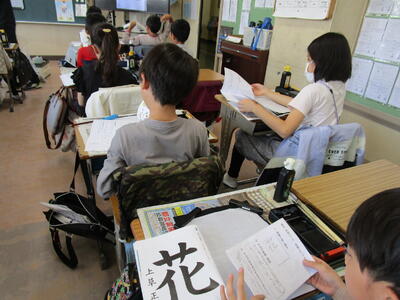 4年生、教務の先生が書写の授業をしていました。「花」の文字の清書をする前に、全体の目標や個人のめあてなど、気を付けることをしっかりと確認していました。