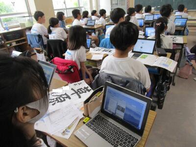 2年生、教室でタブレットを使い、ジャストスマイルドリルのやり方を確認していました。5年生は、算数の残りの時間で、教えあったり、ジャストスマイルドリルをやったりしていました。