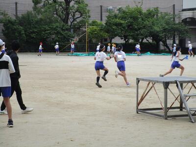 5年生、校庭でハードル走の練習をしていました。ハードルの間隔が自分に合った場所を選んで練習をしていました。