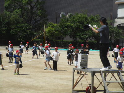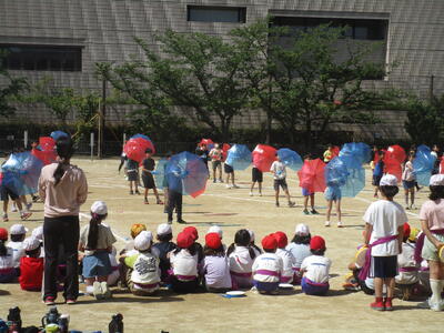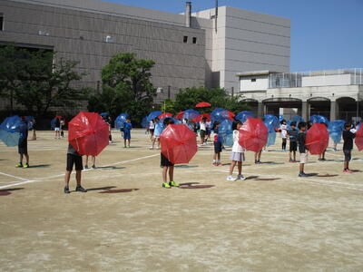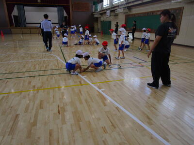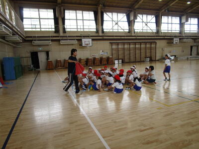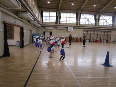 3年生、体育館でボールを使った遊びをしていました。ボールを何回も投げたりとったりできるように、少人数のグループで練習をしていました。