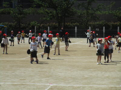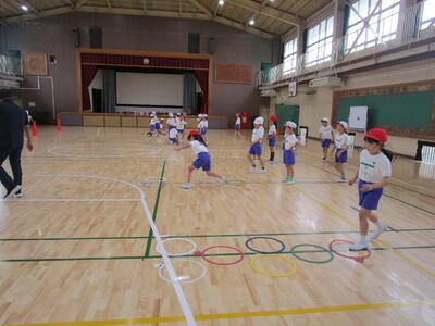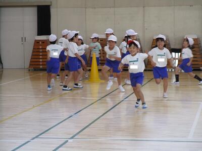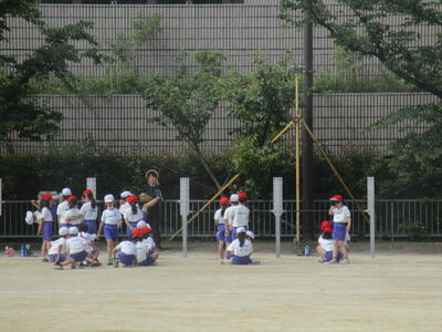 2年生、昨日から3日間、市川市の体育指導の先生が、若年層教諭のクラスの体育の授業をしたり見たりしています。「とびっこ遊び」をしていますが、準備運動で「じゃんけんすごろく」をしたり、とびっこ遊びをしたりしました。とびっこ遊びでは、7枚のケンステップの置き方をグループで相談して、数回、リレーをしていました。