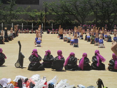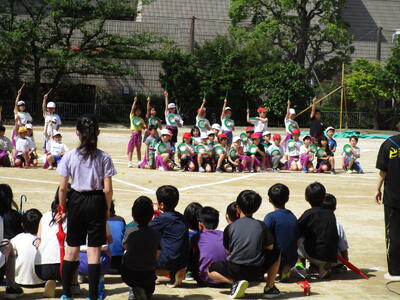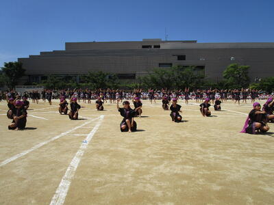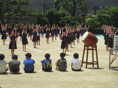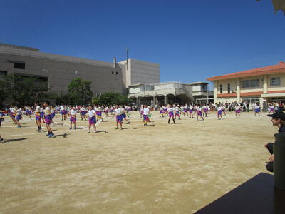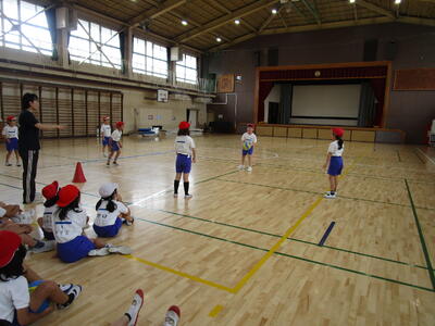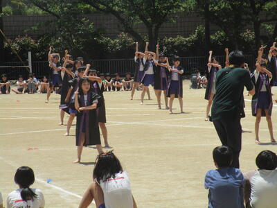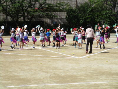 明日の運動会に備えて、団体演技の最後の仕上げでした。1,2年生はそれぞれの学年で、3,4年生及び5,6年生はお互いの演技を最後に見合っていました。見る人がいるので、踊る人もいつも以上に気合がはいっていました。最後には、大きな拍手が…!その後、お互いに感想を伝え合っていました。