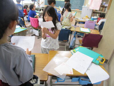 2年生、学校探検の先生インタビューの練習を班や二人組で確認していました。3年生は、音楽室で「あの青い空のように」のやまびこの練習をしていました。皆が代表をやりたがっていて、やる気がすごかったです。
