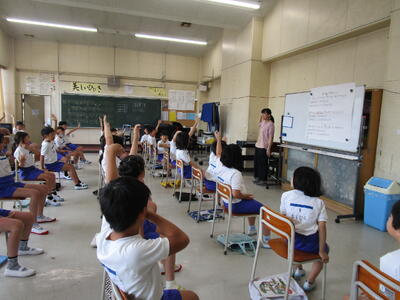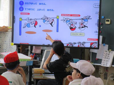 2年生、体育の鉄棒での技を練習するために、教室で画像を見ながら技の説明をしていました。「先生は、『豚の丸焼き』という技と思っていましたが、ここには『おさるさん』と書いてありますね。1年生のときは、どう習いましたか?」と聞いていました。校庭に行き、実際に技に挑戦していました。