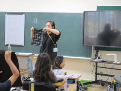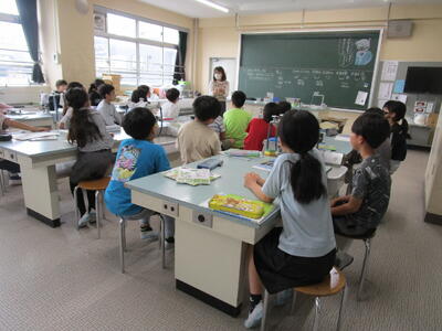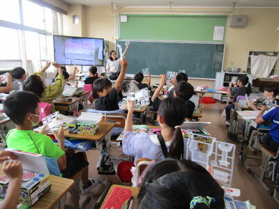 4年生、理科の電池の働きの学習で車を組み立てるようで、キットの中に入っている材料を一つずつ確認していました。