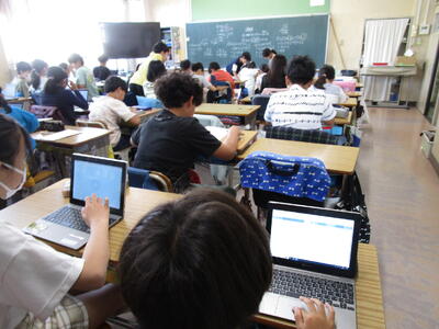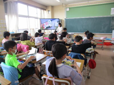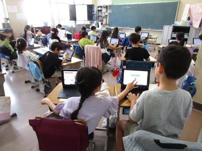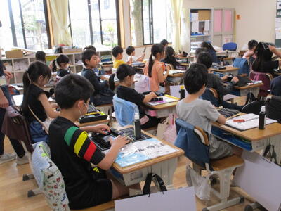 2年生、教室でタブレットを使い、ジャストスマイルドリルのやり方を確認していました。5年生は、算数の残りの時間で、教えあったり、ジャストスマイルドリルをやったりしていました。
