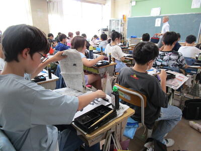 3年生、初めての習字で、非常勤講師の先生を招いての授業です。道具の使い方などを丁寧に確認していました。
