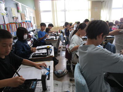 6年生、書写の授業「歩む」の清書です。静まり返った教室の中、集中して作品を仕上げていました。