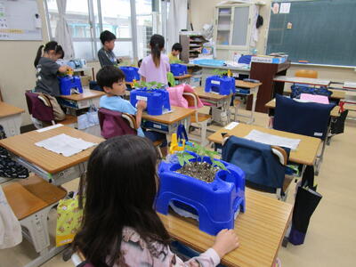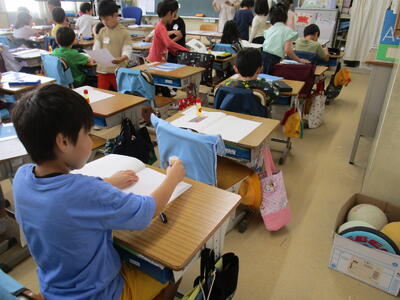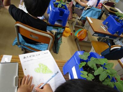 1年生、あさがおの観察を教室でしていました。今日は、葉っぱの形や手触り、枚数を調べながら、ワークシートにかいています。