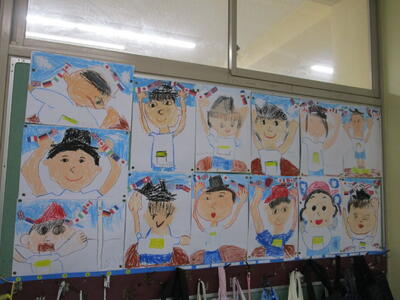 1年生、運動会での生き生きとした踊りの絵が廊下に貼られていました。教室では、運動会のめあてや頑張ったことを書いたプリントをノートに糊ではっていました。頑張ったことには、「にこにこしてえがおでおどれました」「ポーズをきめてかっこよくおどれた」などと書いてありました。