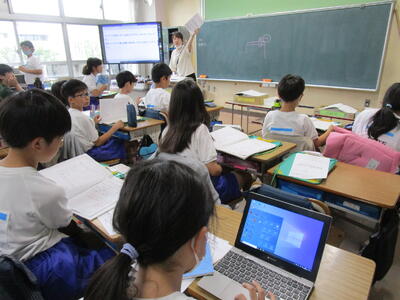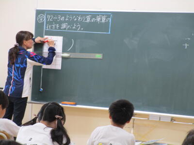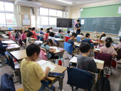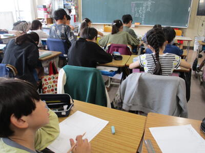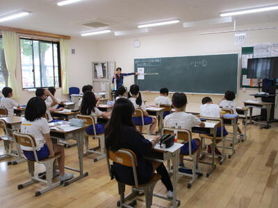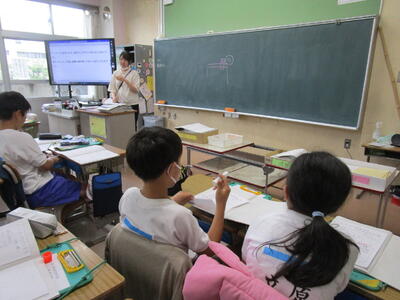 4年生、運動会も終わり、算数で少人数での指導が始まりました。教室と少人数教室2か所に分かれて、20名弱で授業を進めまていました。