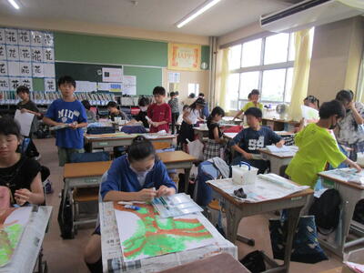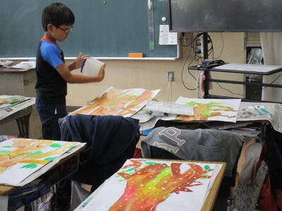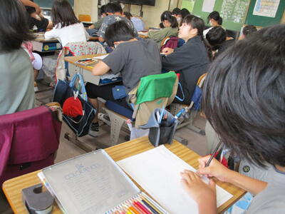 4年生、木をよく見て、絵を丁寧に描いていました。木の幹や枝、葉っぱの色も何色も使って塗ってありました。背景を塗るのに、木を目立たせるにはどうしたらよいのか、子供たちが考え、確認していました。どんな絵ができあがるのか楽しみですね。