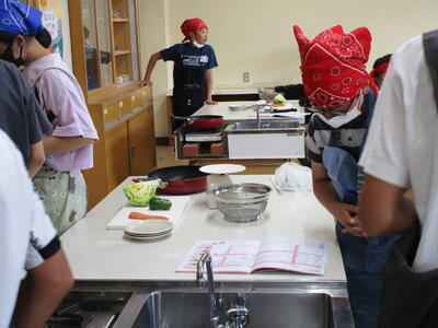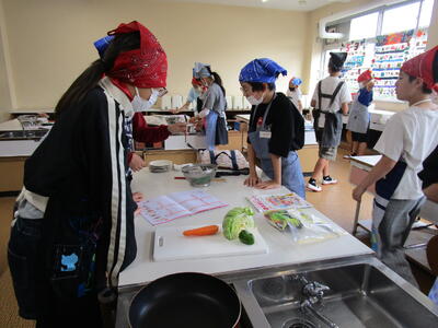 6年生、家庭科で野菜炒めを作っていました。材料は、キャベツ、ピーマン、ニンジンです。おいしくでき上がるといいですね。