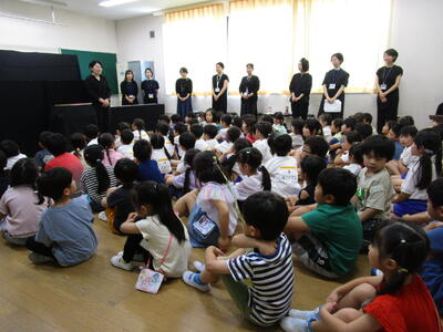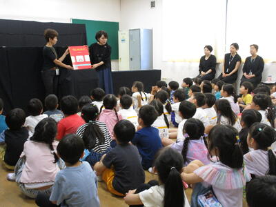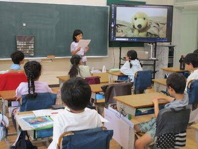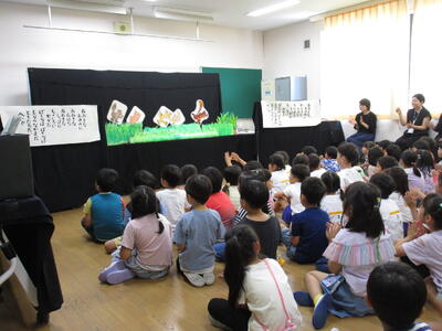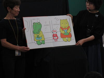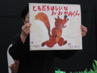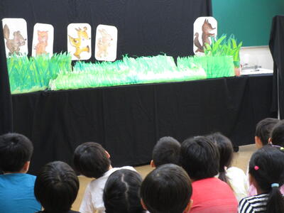 1年生、きらきら星おはなし会がのびのびルームでありました。「でんしゃにのって」では、主人公の女の子が電車に乗っておばあちゃんの家に遊びに行くお話です。途中の駅で、わにやくま、ゾウが乗ってきて、・・・思いもよらない乗客に子供達も大笑いしていました。「ともだちほしいな おおかみくん」は、うさぎやきつねたちに怖がられていたおおかみが、最後にはほかの動物たちと仲よくなるお話です。ペープサートで、動きもあり、最後に歌を歌う場面では、子供たちも拍手をしながら、大きな声で歌っていました。とても、素敵な時間でした。