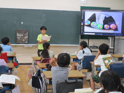 3年生、朝学習の時間に国語で取り組んだ自分の宝物のスピーチをしています。「犬のぬいぐるみ」を選んだ子は、小さい時から寝る時もいつもずっと一緒なので、本当に大切にしているそうです。「水泳の帽子」を選んだ子は、自分ががんばっているものだからとのことでした。どちらも素敵な宝物ですね。