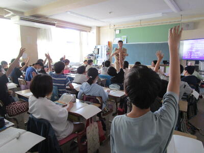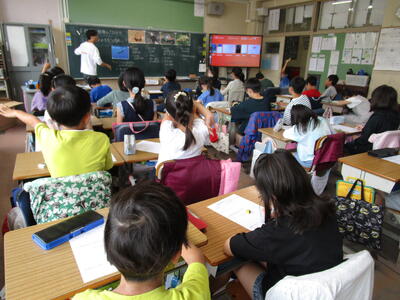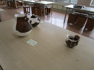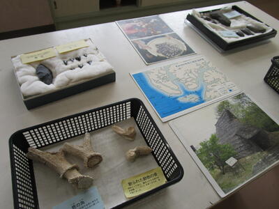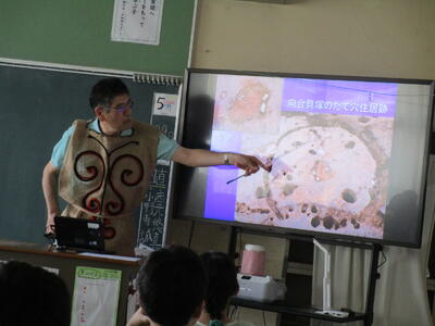 6年生は、社会の学習で「縄文時代」を理解するために、考古博物館の学芸員さんをお招きして、縄文時代の生活について詳しく聞きました。学芸員さんは縄文人が着ていたであろう麻の服を身に着け、教室で画像を使い、わかりやすく説明をしてくれました。また、図工室は、服や石器、土器などが展示され、6年生が見学できるミニ博物館になっていました。