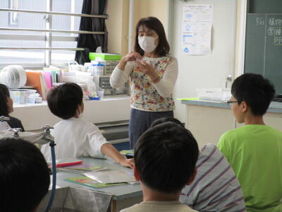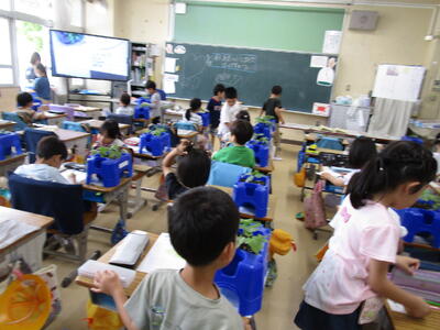 5年生、理科専科の先生と理科室で学習をしていました。発芽の条件を調べるために、条件をかえて、班で協力して実験の準備をしていました。