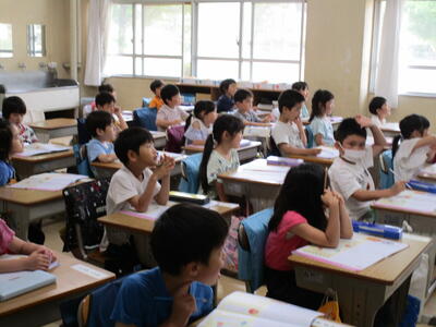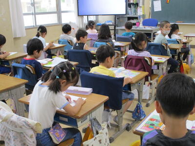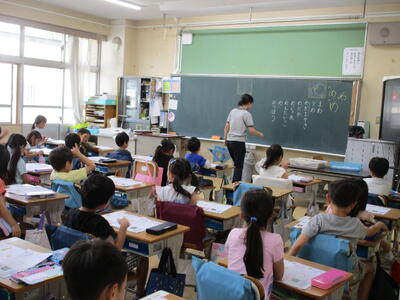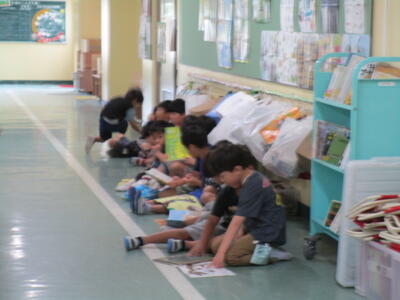 1年生、国語で「あかさたな ・・・」等、発音の練習をしているクラスや言葉集めをしているクラス、体育の着替え中に廊下で静かに本を見て待っているクラスもありました。