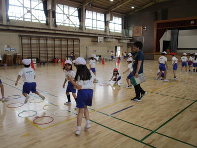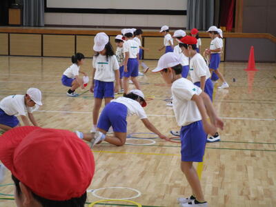 2年生、若年層の教諭を指導する体育指導員の先生が見守る中、担任の先生が「とびっこ遊び」の授業をしました。3日間取り組み、子供たち、7つの輪の置き方を工夫して、チームで考えたリレーを楽しんでいました。体育指導員の先生と今日でお別れなので、「先生、ずっと大和田小にいてください」「授業がとても楽しかったです」等の感想が寄せられ、別れを惜しんでいました。