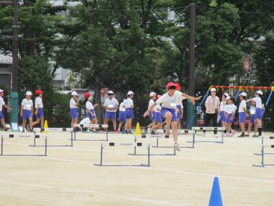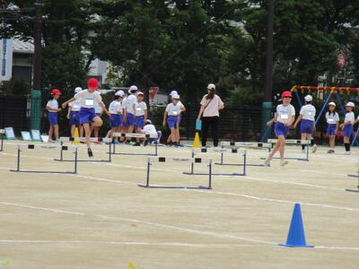 5年生、校庭でハードル走の練習をしていました。ハードルの間隔が自分に合った場所を選んで練習をしていました。