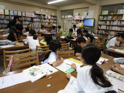 2年生、図書室で本を使って調べる活動をしていました。調べた本の題名や作者を書くために、本の中の作者名のある場所を皆で確認していました。