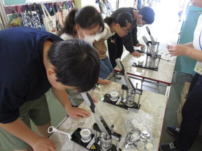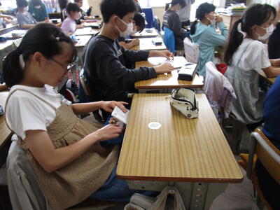 6年生、今日は市川市の缶バッジをマシーンを使って作成しています。きれいに作るのはなかなか難しいのですが、頑張っていました。