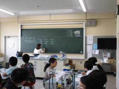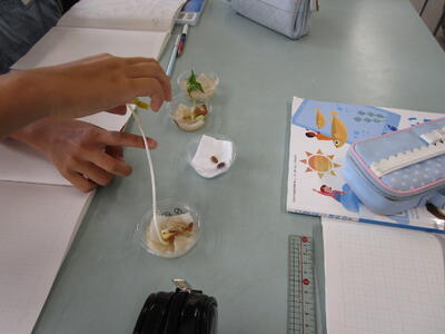 5年生、理科室で、発芽の条件を、実験の結果をもとに、確認していました。発芽していないもの、もやしのように伸びているものもあり、子供たちは、実験の結果からわかることを考えていました。