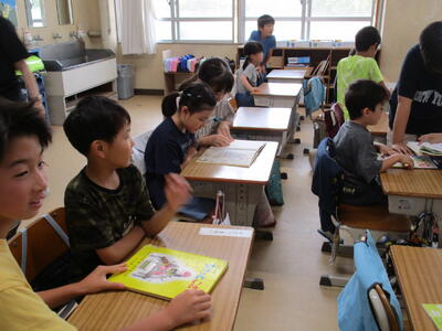 1年生、月曜日の朝読書の時間に6年生のペアのお兄さんやお姉さんが、教室・図書室・体育館で読み聞かせをしてくれました。とても、優しくお話を読み聞かせする6年生と、嬉しそうに聞く1年生、見ているだけで心がほんわかします。5年生の教室では、同じく朝読書の時間に担任の先生が「しげちゃん」という絵本を子供たちに読み聞かせしていました。先生の周りで、真剣に聞く子供たち。本は心の栄養ですね。