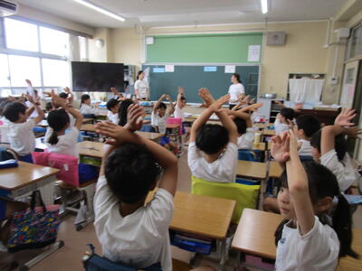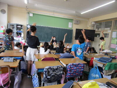5年生、保健体育の保健の授業です。ストレスを感じた時の対応方法で、教科書にのっている「深呼吸」や「曲に合わせて、体を動かす」を実際に教室でやっていました。とても、楽しそうです。