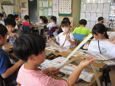 1年生、図工の絵の具の使い方を学習していました。「水入れは、部屋が3つに分かれていて、筆を洗う部屋と足し水をする部屋に分かれています。濁った水を使ってしまうときれいな色になりません」と先生が言うと、「へー」とうなずく子供たち。細かことを気を付けるのが大切なんですね。