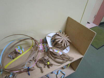4年生、図工で「つないで組んですてきな形」の作品を作り始めていました。ひもを組んだり、編んだりして、いろいろな形を作る学習です。廊下には、ほかのクラスの途中の作品が置いてありました。子供の創造力、豊かです。同じく4年生、体育館で2年生の新体力テストの測定を手伝った後に、自分たちの測定です。