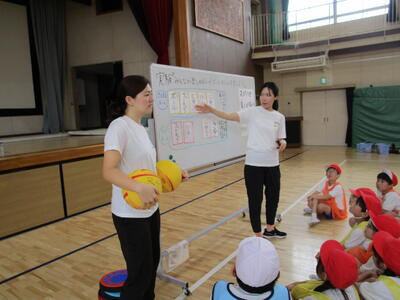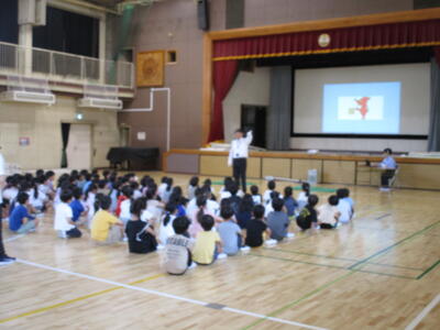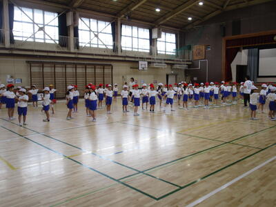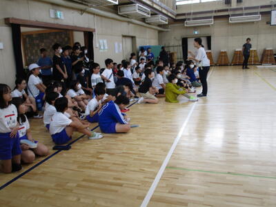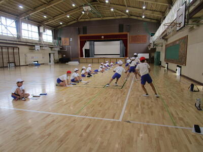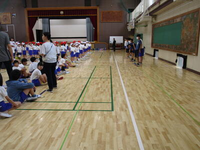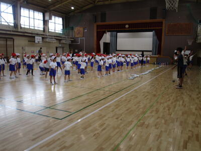 1年生の新体力テストの測定を6年生がお手伝いをするために、体育館に集合しました。6年生には、6年生の先生から特に気を付けるとよいことについての話がありました。1年生は、6年生の体育委員さんの号令で張り切って準備体操をしていました。