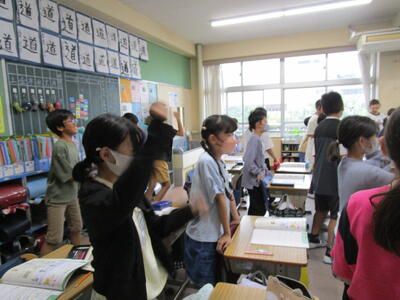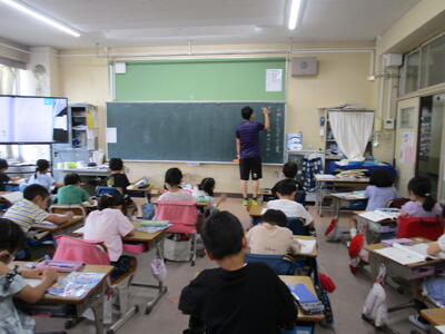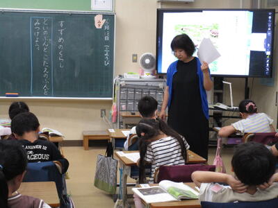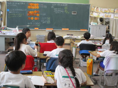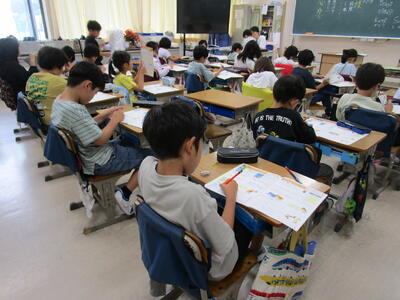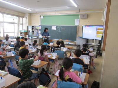 3年生、漢字の学習を書き順をしっかり全員で確認していました。隣のクラスでは、国語で「生き物ブックをつくろう」をゴールにして、調べ学習をしてワークシートを書いていました。タコの足、いかの足を比べている子や、生き物の羽を比べている子、足の速さを比べている子など、一人ひとりのテーマが違っていて、クラス全体でまとめたら、とても楽しい生き物ブックができそうです。