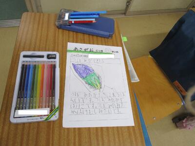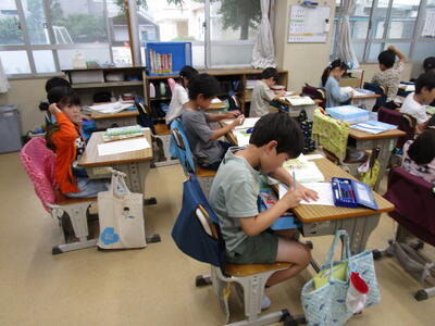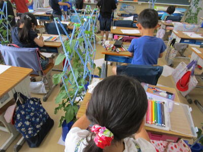 1年生、生活科で朝顔を育てていて、その様子をワークシートにかいていました。よく見られるように鉢を自分の横に置き、つぼみを中心に観察していました。2か月ですっかりと大きくなり、花が咲いている子もいてとてもうれしそうです。4枚目なので、カードの書き方も上手になりました。ある児童のカードをそのまま紹介します。「つぼみのかたちは、まるほそいです。つぼみのかずは、11こです。つぼみのみためは、けむしみたいです。」表現力が豊かですね。