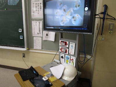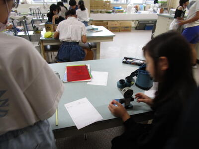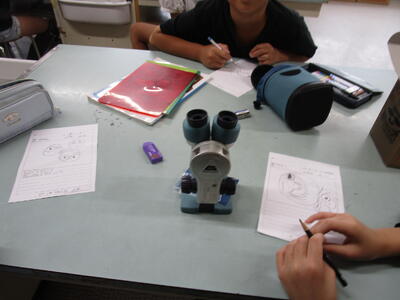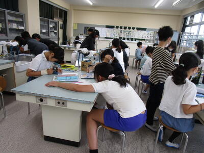 5年生、理科室で小さい袋にいれたメダカの卵をネイチャースコープで、見ています。「あっ、目が見える」と子供が言うと、専科の先生が「目以外のところもよく観察して、ワークシートにかいてください」と話し、子供たちとても細かい部分までも観察、記録していました。